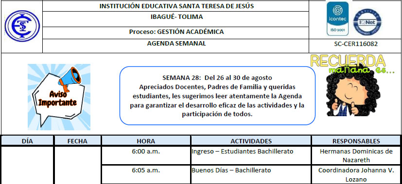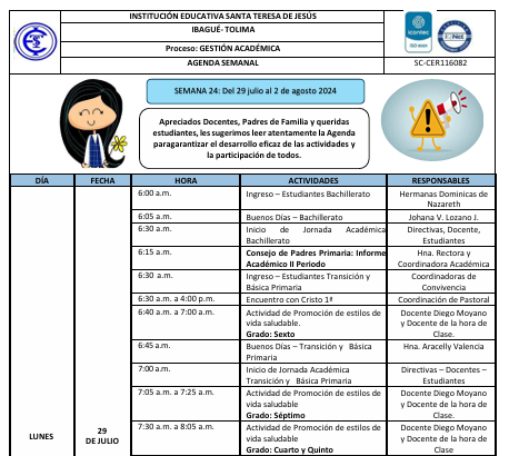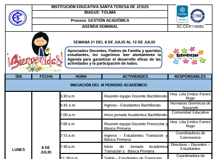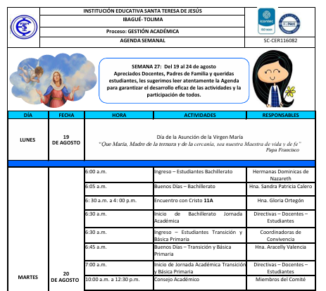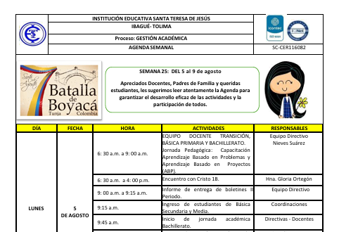 Apreciados Padres de Familia, Reciban un saludo especial con nuestros mejores deseos de paz y bienestar en sus Hogares. Nos permitimos dar a conocer la actualización de la Agenda 25 del 5 al 9 de agosto y el Horario del 7 de agosto.