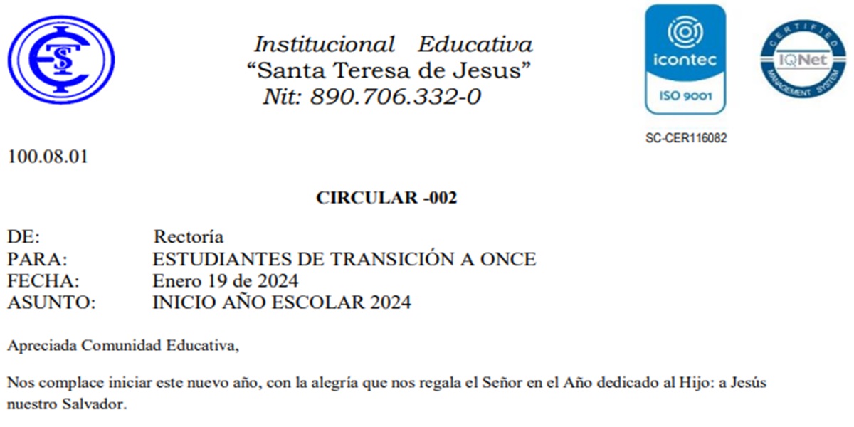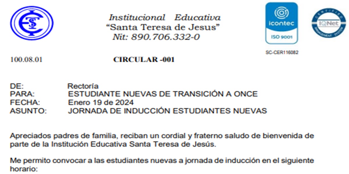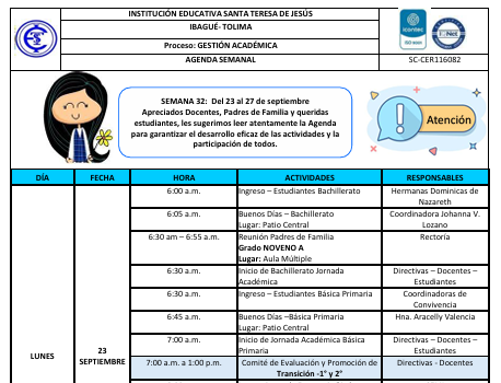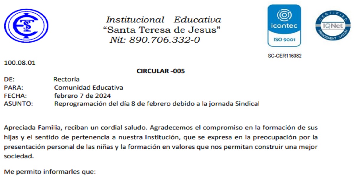 CIRCULAR DE: Rectoría PARA: INFORMACIÓN IMPORTANTE FECHA: Septiembre 19 de 2024 ASUNTO: Horario de clases 19 de septiembre de 2024.